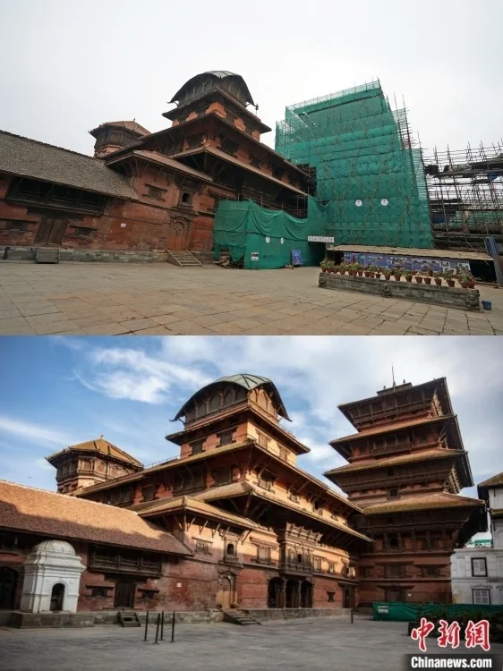 2015年4月,尼泊尔突发8.1级强烈地震。剧烈的冲击与摇晃之下,包括九层神庙及附属建筑在内的众多文物古迹遭受严重破坏。 上图为当地时间2019年12月12日,尼泊尔加德满都杜巴广场。九层神庙修复项目工地。 下图为尼泊尔首都加德满都杜巴广场修复后的九层神庙。(资料图)
