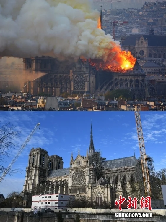 巴黎圣母院始建于12世纪,是法国最具代表性的古迹之一。当地时间2019年4月15日,巴黎圣母院突然遭遇大火,受损严重。历时5年修缮,耗资约7亿欧元,来自150个国家的34万人“慷慨解囊”,其修复在法国被视为“头等大事”,也备受国际关注。共2000多名工匠和建筑师、工程师、史学家等专家参与了巴黎圣母院的“重生”,其中,就有来自东方的助力。 上图为当地时间2019年4月15日,巴黎圣母院遭遇大火。 下图为当地时间2024年12月6日,巴黎圣母院在为重新开放做最后准备。巴黎圣母院于当地时间2024年12月7日重新开放。