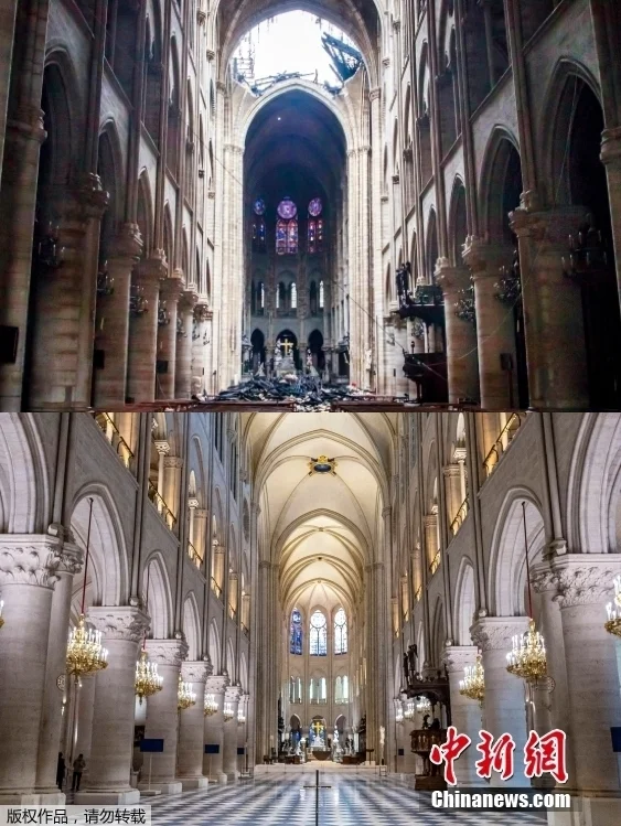中国是第一个与法国就修复巴黎圣母院达成政府间协议的国家。火灾发生后,中法文化遗产主管部门多次函件来往,讨论合作设想。 上图为当地时间2019年4月16日,巴黎圣母院被烧毁后的内景。 下图为当地时间2024年11月29日,修复后的巴黎圣母院内景。