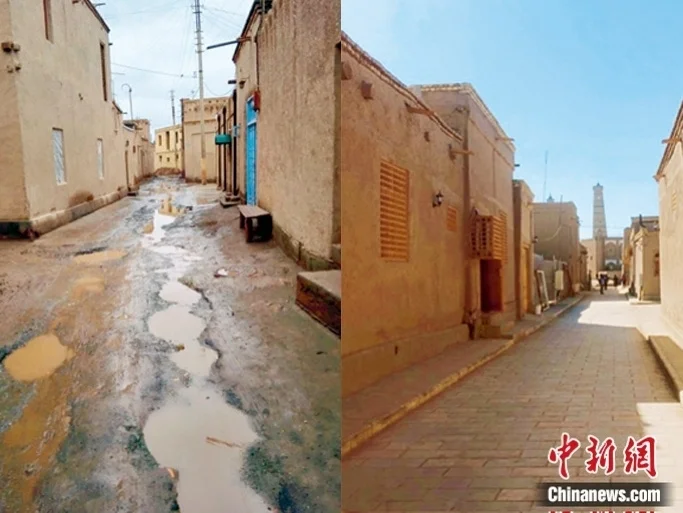 仅仅修文物还不够,希瓦古城的修复项目位于居民生活区。阿米尔·图拉经学院与哈桑·穆拉德库什别吉清真寺正是位于北门主干道两侧,这样的周边环境长期持续,对不可移动文物本体也会造成损坏。因而,整体环境的整治也提上中方工作组的日程,以期实现当地文物保护和旅游发展两全的目标。图为修复前后的民居建筑及周边道路环境。许言 供图