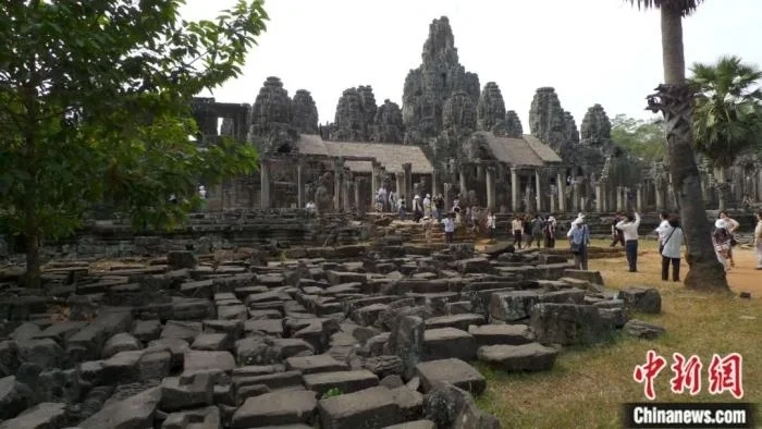 中国工作队一直坚持“最小干预”“可逆”原则,最大限度保护文物的历史信息,并将这一理念运用在柬埔寨茶胶寺山花的维修上。山花是寺庙塔门上的石构件,通常由几块石头拼接而成,刻有精美图案。在许多修复案例中,吴哥寺庙建筑山花的维修往往通过打锚杆的方式,把构件串起来。图为大吴哥巴戎庙前未修复的砖石。中新社发 云云 摄