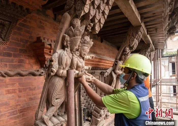 由于尼方对九层神庙“形神兼备”的修复高度认可,中方后来又承担了该国努瓦科特杜巴广场王宫修复一期项目(2020-2024年)。图为尼泊尔首都加德满都杜巴广场九层神庙修复现场。(资料图)中国文化遗产研究院 供图