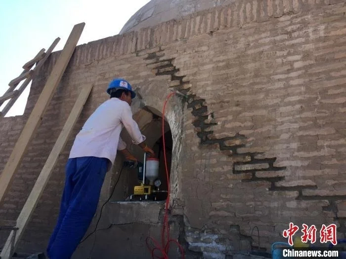 希瓦古城修复工作不仅是一项工程,也是一个研究的过程,更是个文化互相交流、双向传播的过程。图为“援乌兹别克斯坦花剌子模州希瓦古城历史文化遗迹修复项目”墙体裂隙注浆工程。(资料图)周鹏 摄