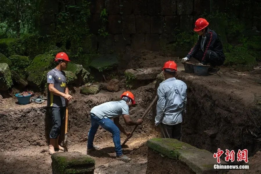 2019年,柬埔寨政府将遗产核心区域的王宫遗址交给中国作为吴哥古迹保护第三期修复项目。王宫遗址修复项目工期为11年,项目内容包括文物建筑修复、考古研究、石刻保护、实验室建设、展示中心建设、环境整治和遗址展示等。图为中国援柬埔寨吴哥古迹(三期)王宫遗址保护修复项目工作现场。李震 摄