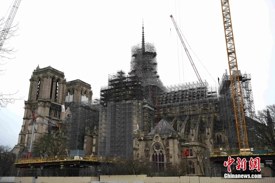 2024年2月,中国陕西省秦始皇帝陵博物院专家前往巴黎,这是国际上首次对巴黎圣母院炭化木样本进行研究,中国专家也是第一支登上巴黎圣母院塔尖的非法国专业团队。图为当地时间2024年2月12日,处于修复中的巴黎圣母院。中新社记者 李洋 摄