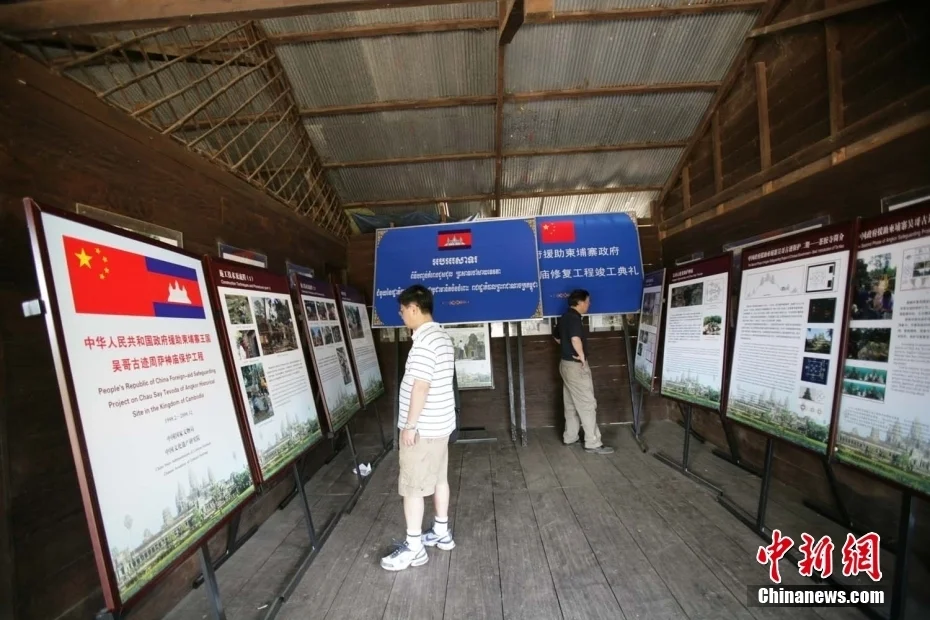 “吴哥古迹保护国际行动”被联合国教科文组织誉为文化遗产保护国际合作的典范,闪耀着人文关怀与国际精神。中国是最早参与“吴哥古迹保护国际行动”的国家之一,中方工作团队在吴哥古迹保护领域取得的一系列成就,反映的是多年来中国文物保护队伍的不断壮大和技术力量的持续提升。图为2008年12月,游客在柬埔寨吴哥窟的周萨神庙观看中国吴哥保护工作事迹。洪少葵 摄