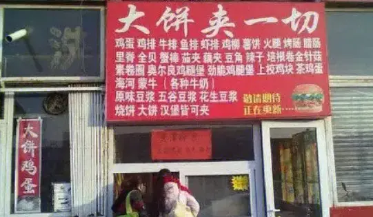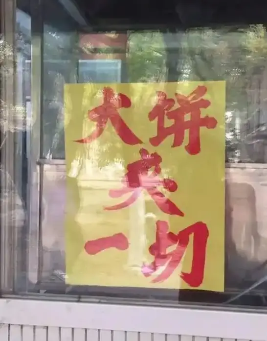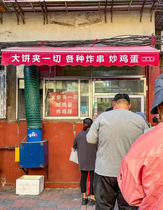而摊主的标语,也秉承食材的多元和直球风格,相比精致餐饮中的人设管理,大饼夹一切的存在,似乎是一次对于人设崩塌的集体庆祝,不需要颜值,不需要滤镜,只需要一张嘴和一点勇气。
