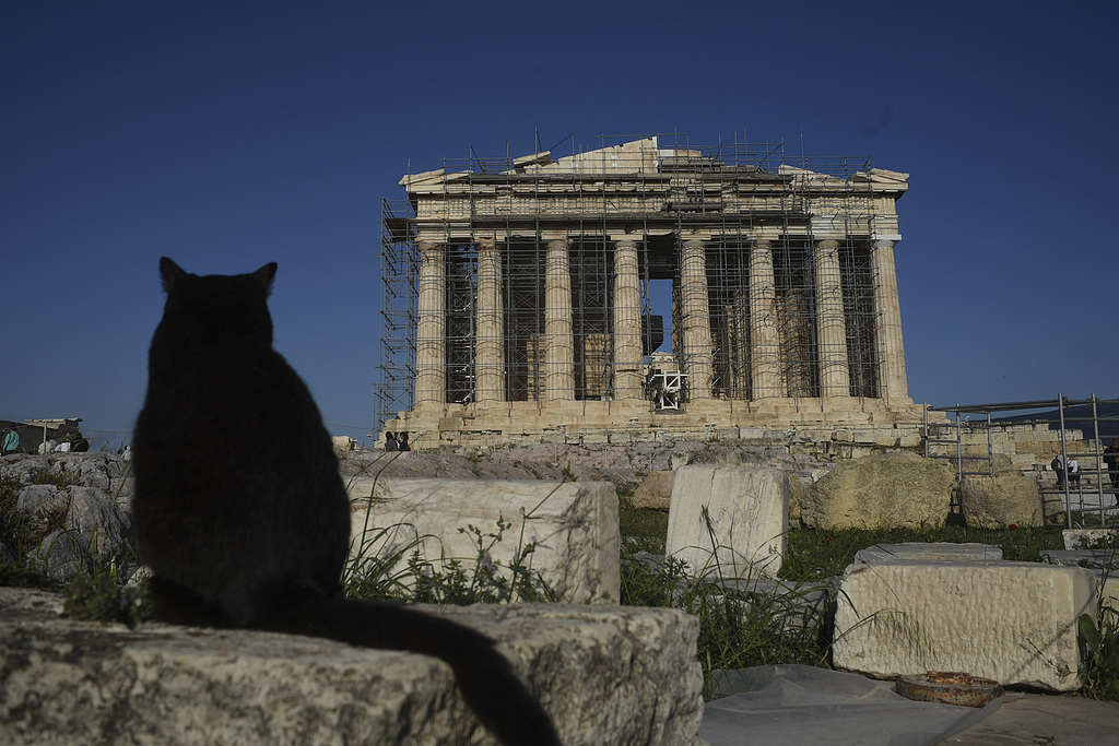 当地时间2025年4月13日,希腊雅典,一只黑猫在雅典卫城古老的女神雅典娜神庙前。视觉中国 图