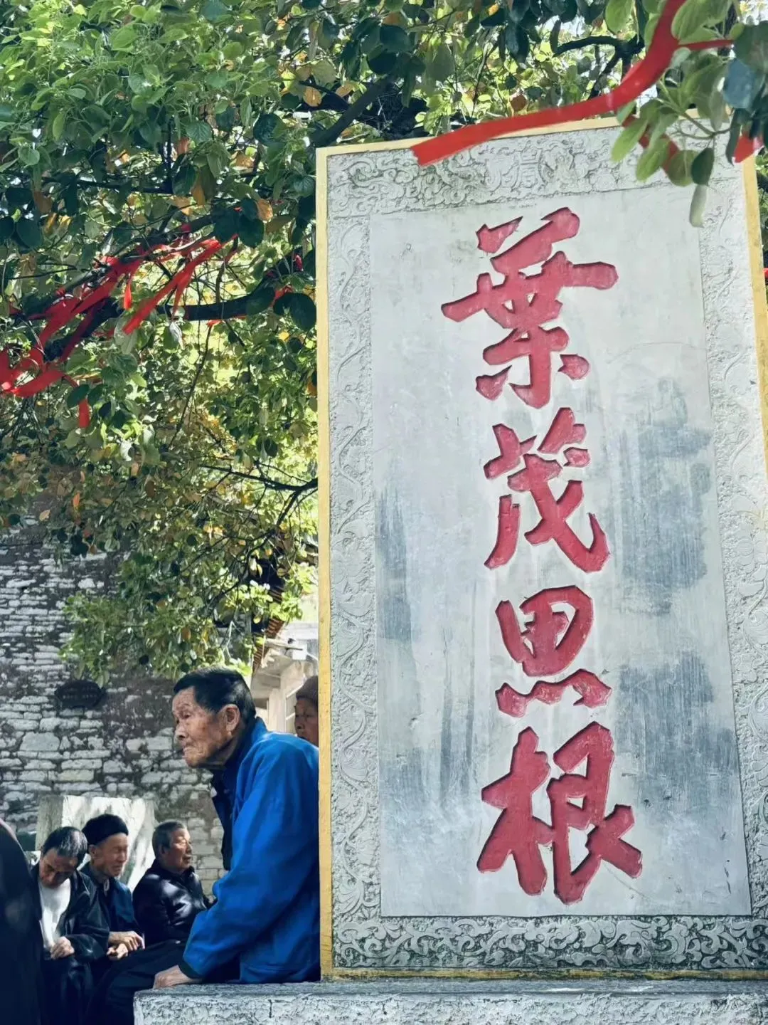 对面的大树下,老人们聚在一起,石碑上写着——叶茂思根。
