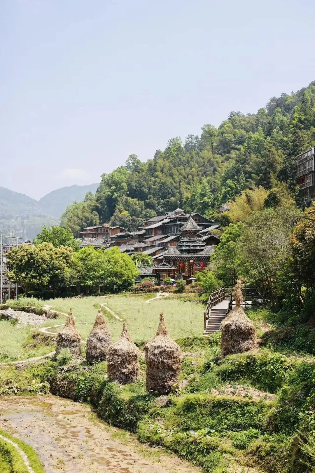 站在寨门的入口,近处是一片农田,远处一栋栋古朴别致的吊脚楼掩映在群山间,彷佛看不见尽头。