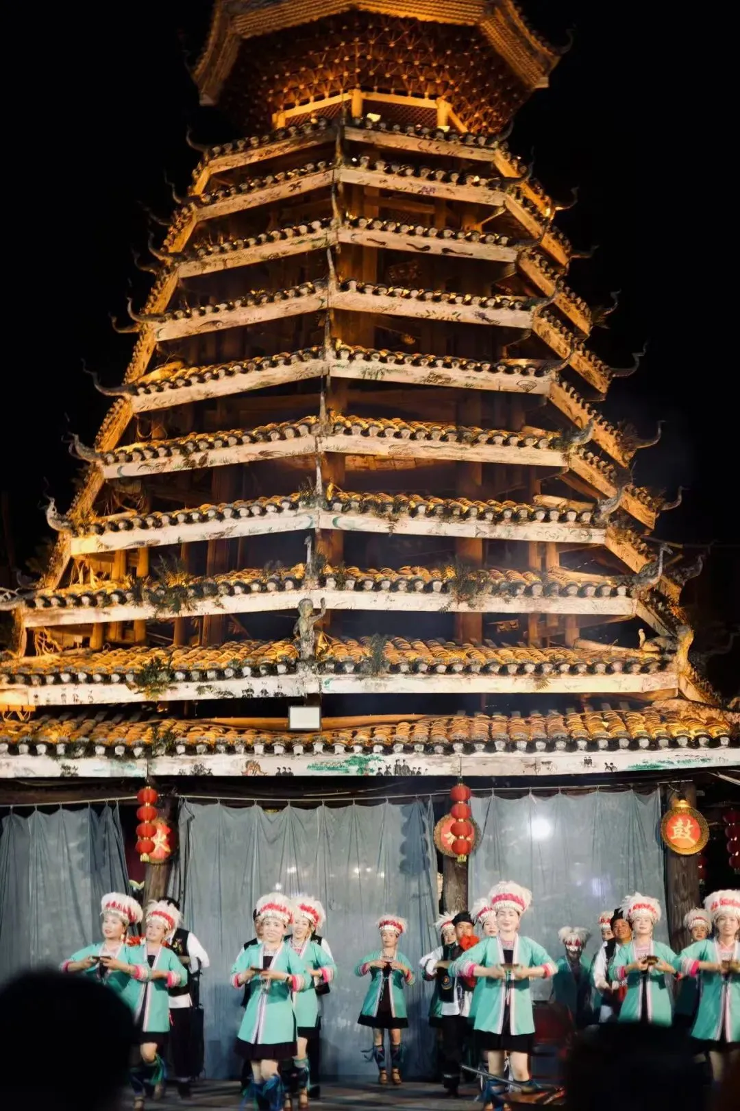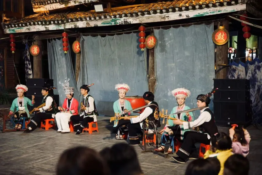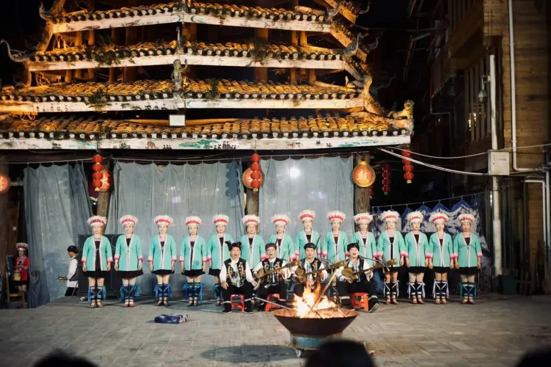 在肇兴侗寨,侗家人载歌载舞,鼓楼的飞檐勾连云影。