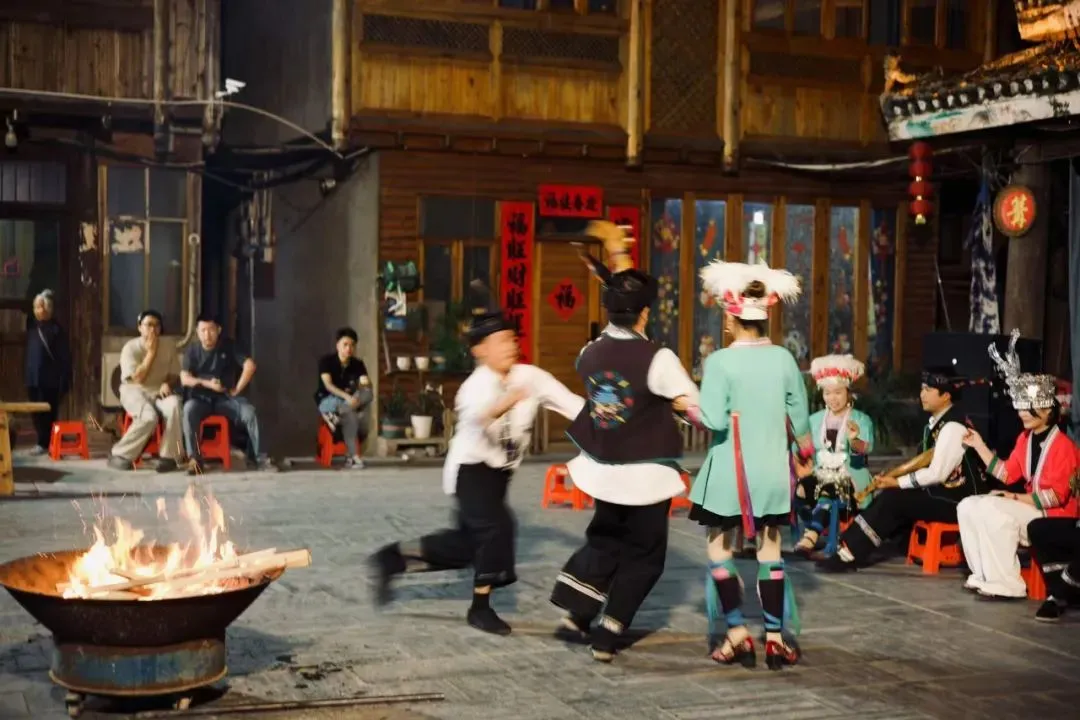 姑娘们带着烁烁生辉的银饰品,身穿刺绣精致的裙裾和尖而软的布鞋,在夜色歌舞和欢呼下,跳起来。
