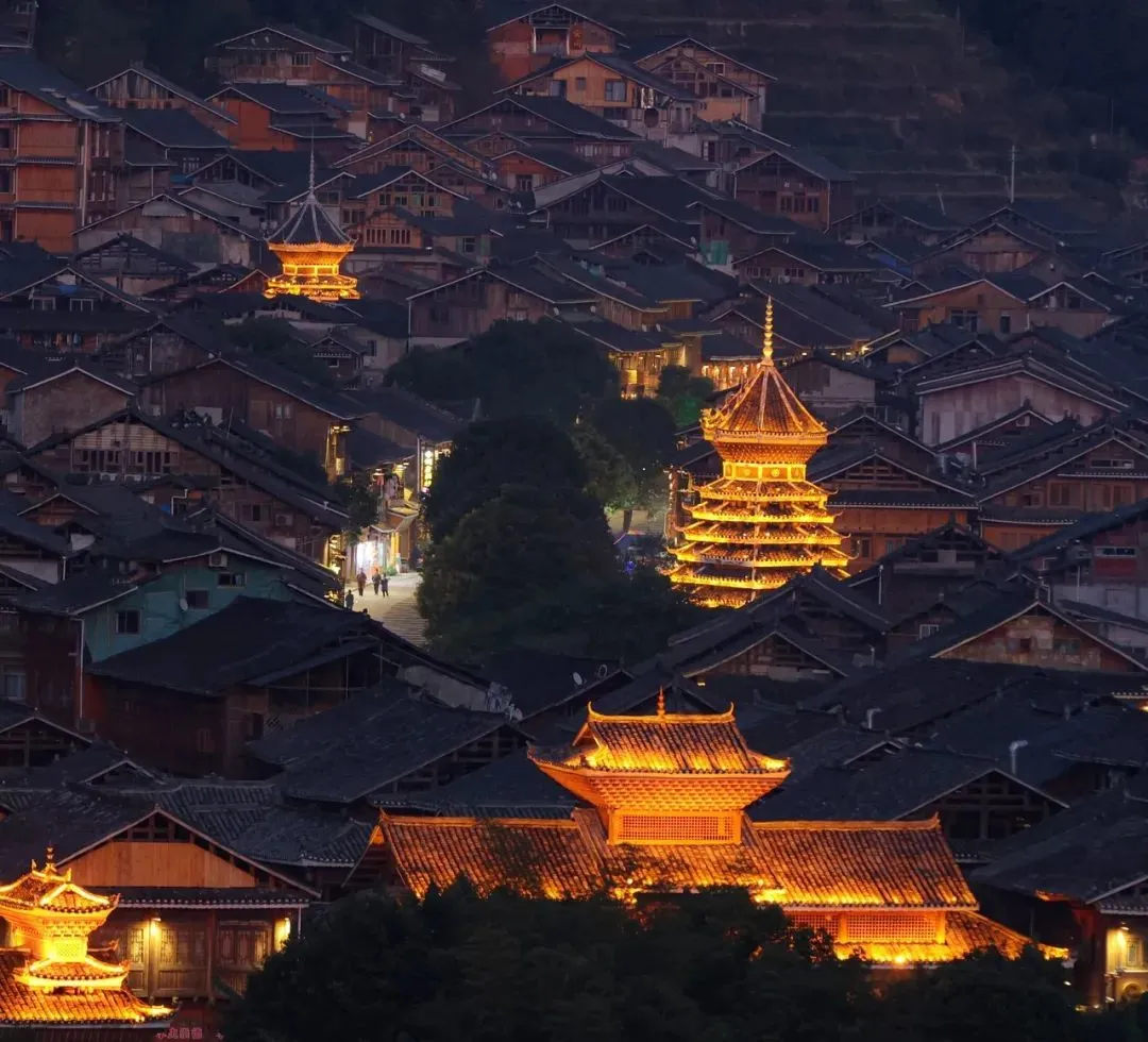 山的轮廓已模糊在黑夜里,灯火通明的寨子、鼓楼,给人像是误入了《千与千寻》里的那个地外世界——油屋。
