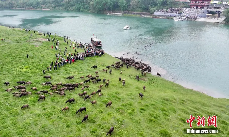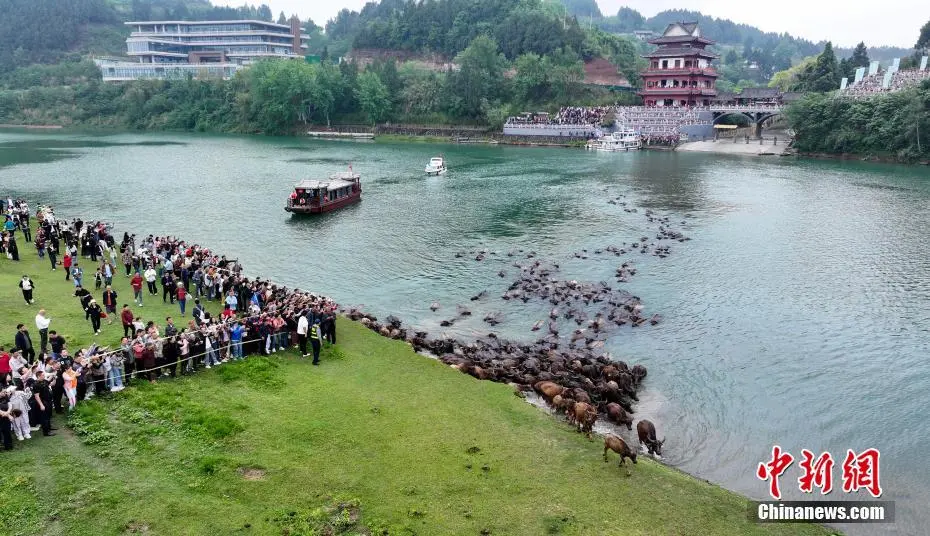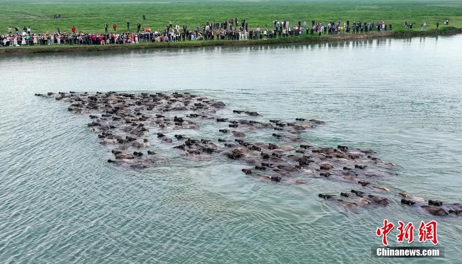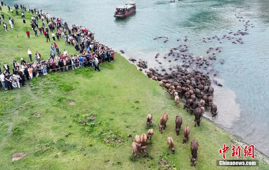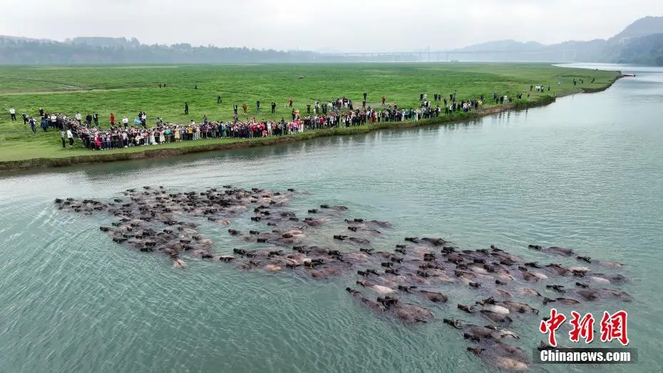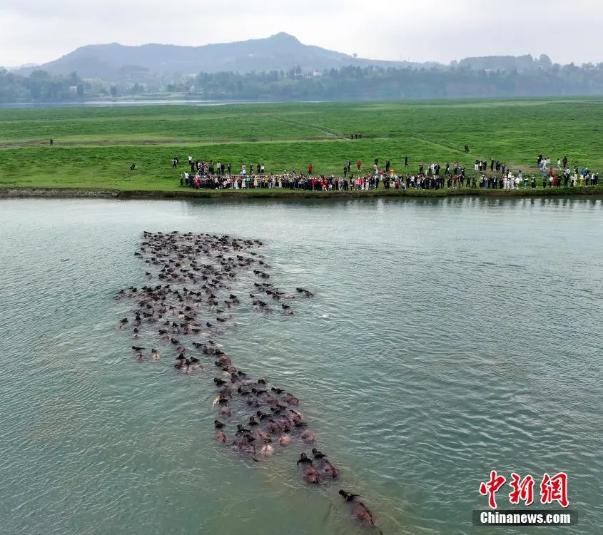 4月27日上午,四川省南充市2025年嘉陵江放牛季在蓬安县相如街道油房沟社区启幕,现场吸引众多游客和市民前来观赏游玩。当日上午,随着栅栏门的开启,早已等候在此的200余头大大小小水牛争先恐后冲向嘉陵江,奋力向水草丰茂的江心太阳岛游去。在波光粼粼的江面,牛儿们不时变换队形,如同跳起了“水上芭蕾”。经过四五分钟踏浪前行,它们登上太阳岛,开始欢快地啃食青草、追逐嬉戏。图为200余头水牛奋力向水草丰茂的江心太阳岛冲去。刘永红 摄