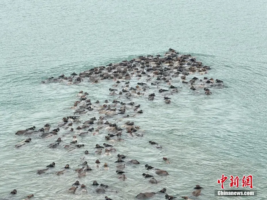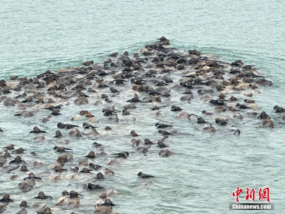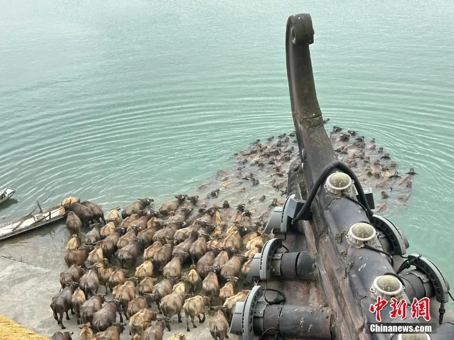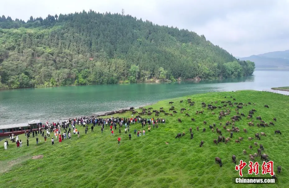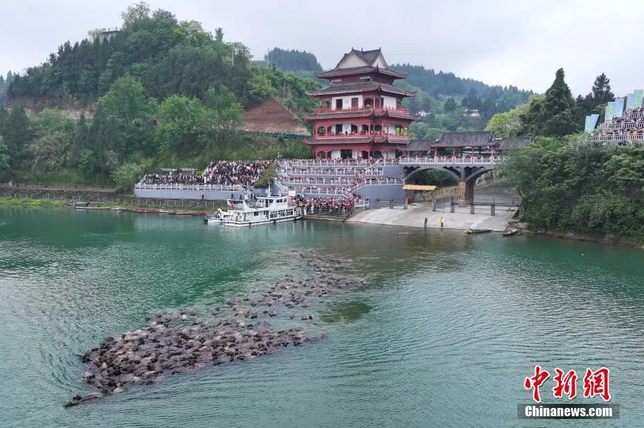 4月27日上午,四川省南充市2025年嘉陵江放牛季在蓬安县相如街道油房沟社区启幕,现场吸引众多游客和市民前来观赏游玩。当日上午,随着栅栏门的开启,早已等候在此的200余头大大小小水牛争先恐后冲向嘉陵江,奋力向水草丰茂的江心太阳岛游去。在波光粼粼的江面,牛儿们不时变换队形,如同跳起了“水上芭蕾”。经过四五分钟踏浪前行,它们登上太阳岛,开始欢快地啃食青草、追逐嬉戏。图为200余头水牛奋力向水草丰茂的江心太阳岛冲去。刘永红 摄
