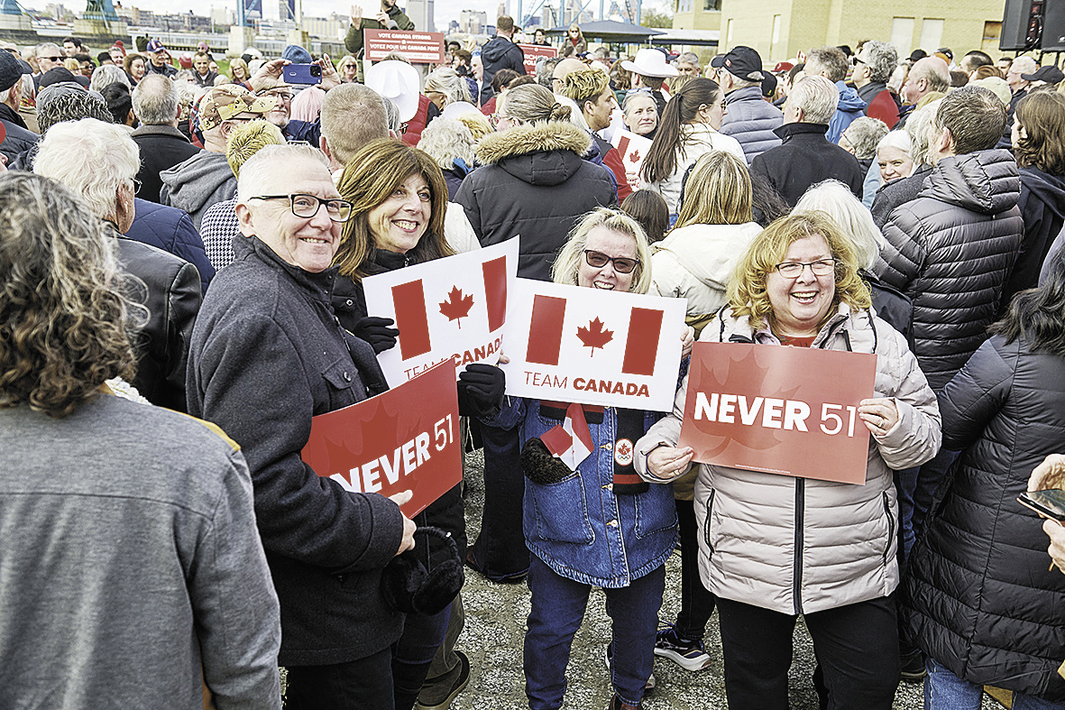 当地时间4月26日,加拿大安大略省,在总理、自由党党首卡尼的竞选集会上,民众举着“绝不成为美国第51个州”的标语。图源:法媒