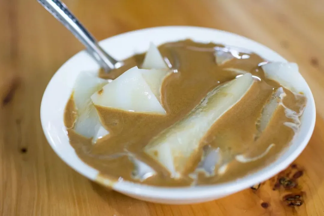 但亦有更多人推荐去发源地苏稽古镇,点碗徐凉糕,米香味极浓,配以翻沙红糖,再来一钵周老三跷jio,是真惬意。
