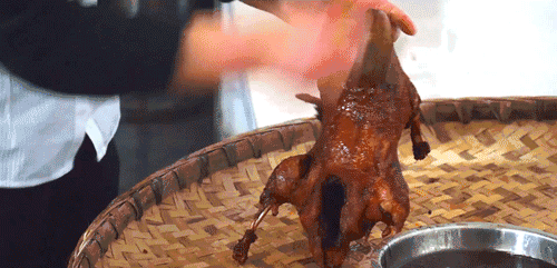甜皮鸭是用滚油一勺勺地烫熟,等鸭皮下流出多余的油脂后,形成酥脆的外皮。