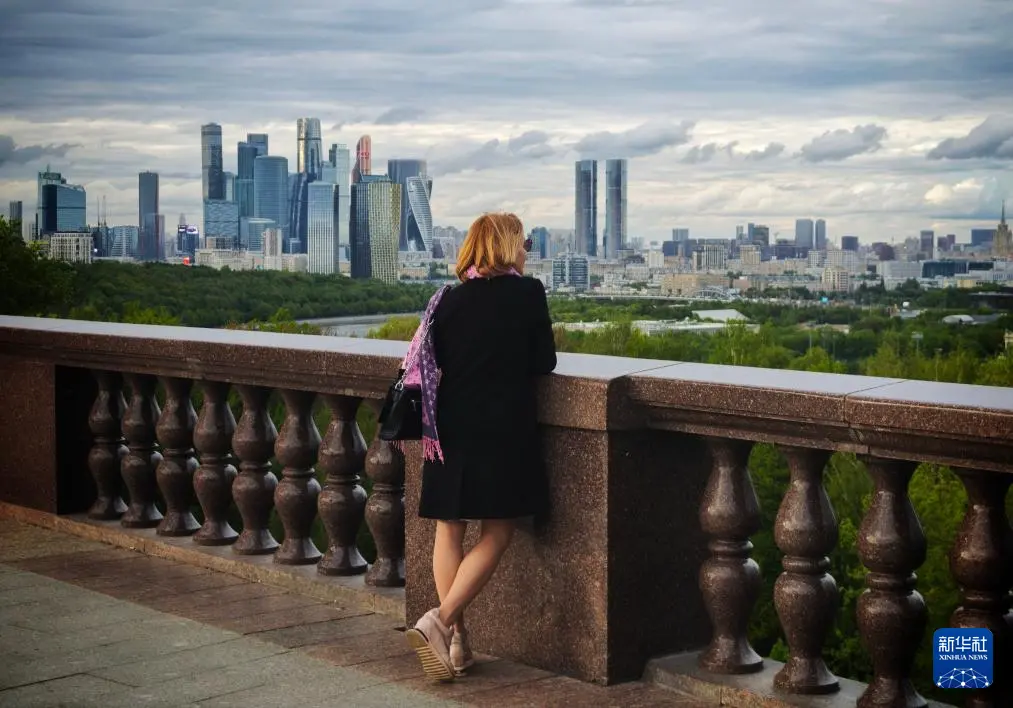 5月5日,在俄罗斯莫斯科,一名女子在麻雀山观景台上远眺。