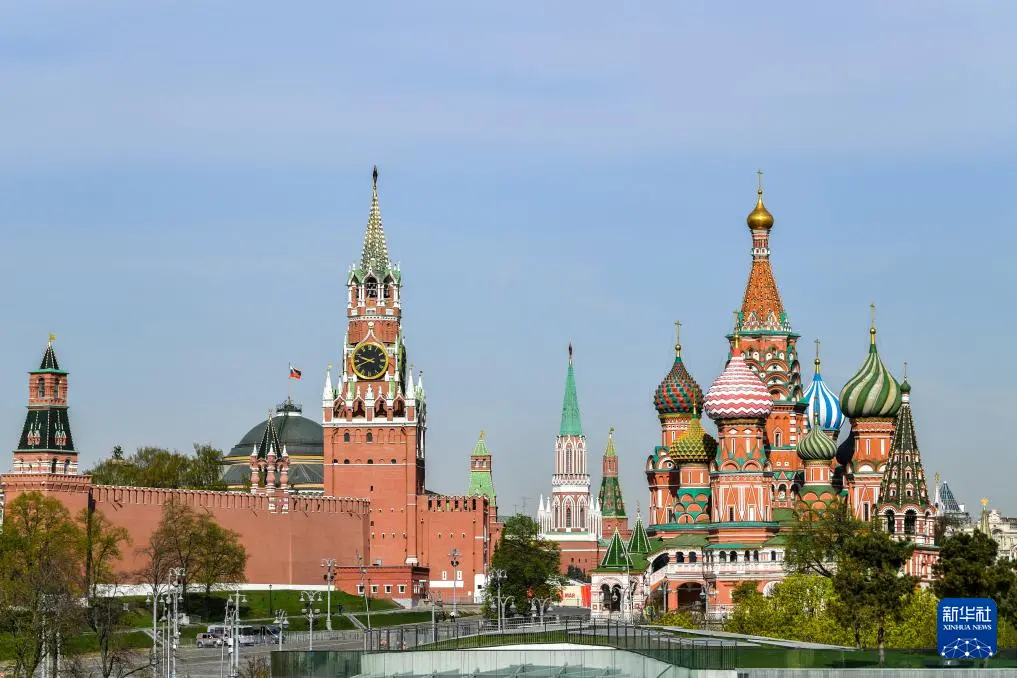 这是4月21日在俄罗斯莫斯科拍摄的克里姆林宫和圣瓦西里教堂。