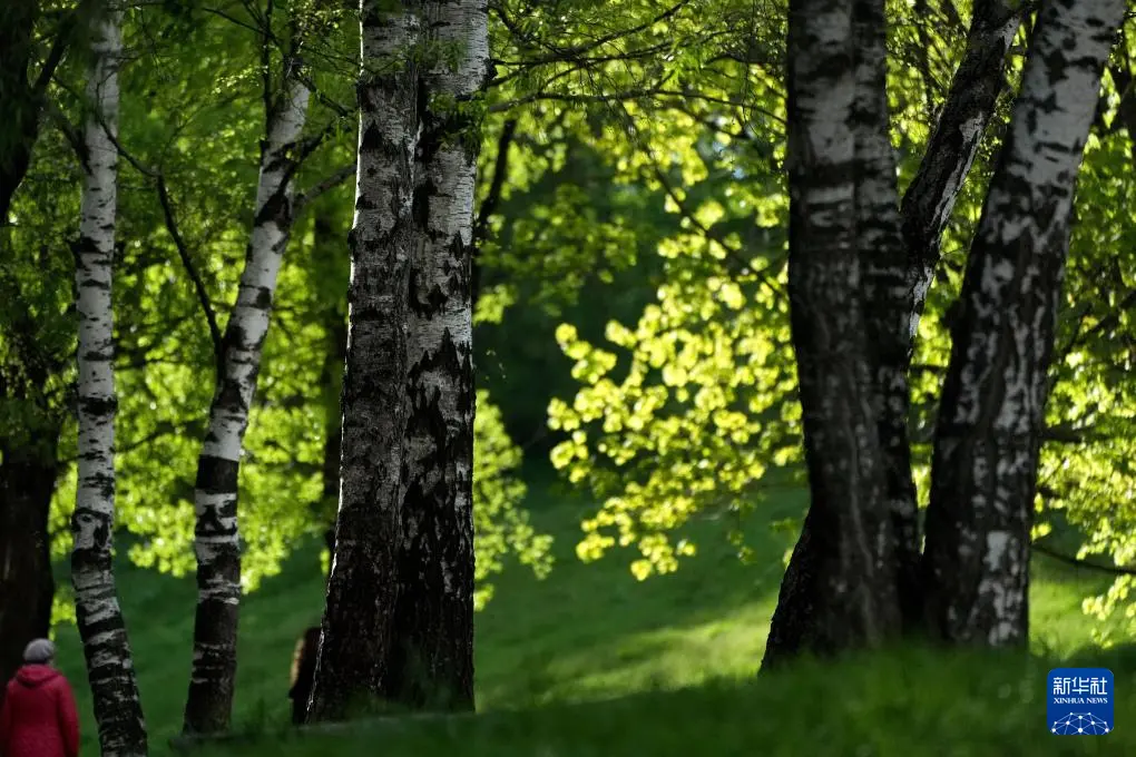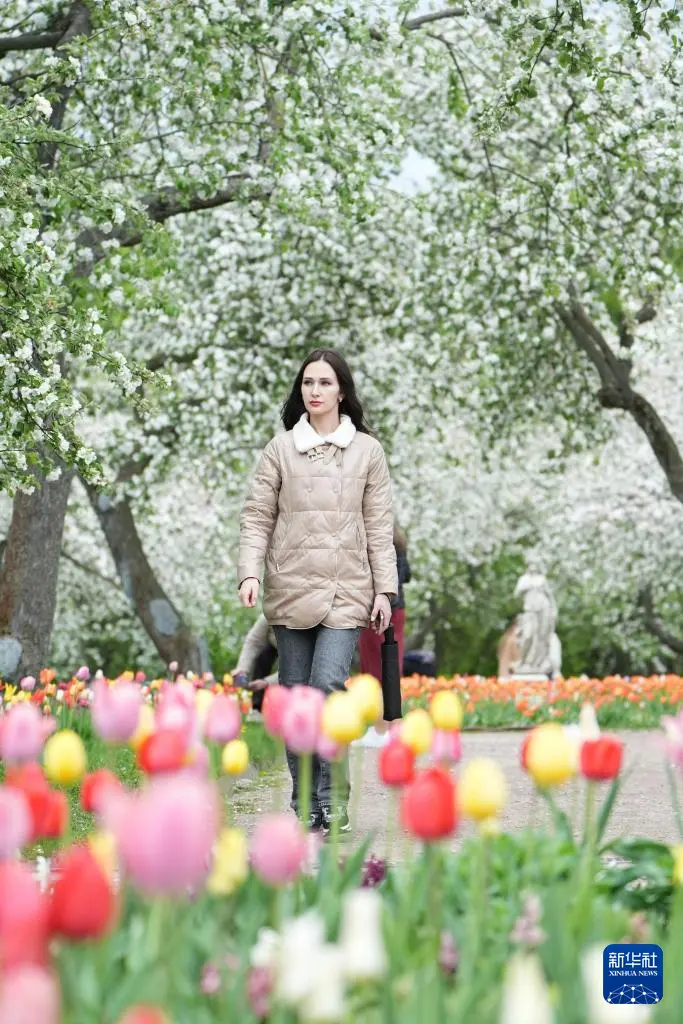 5月5日,在俄罗斯莫斯科,一名女子在科罗缅斯克庄园内休闲。