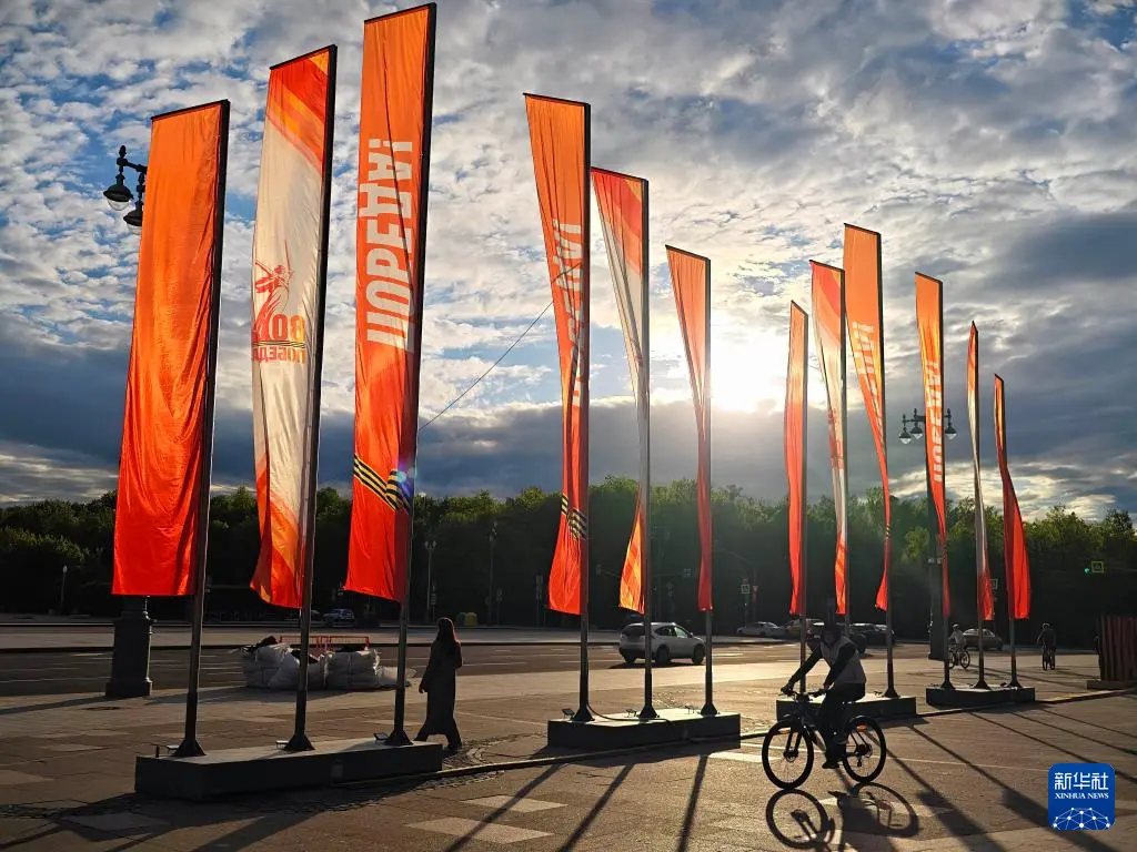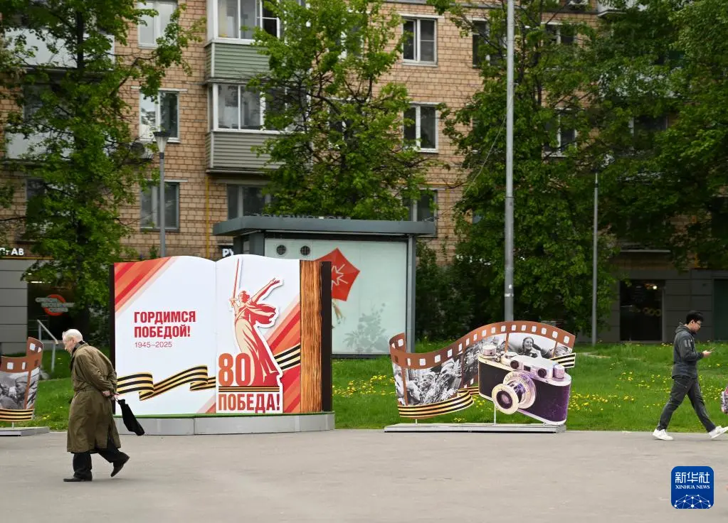 5月6日,在俄罗斯莫斯科,人们经过街头的胜利日装饰。