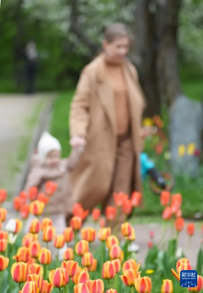 5月5日,一名女子带孩子在俄罗斯莫斯科科罗缅斯克庄园内玩耍。