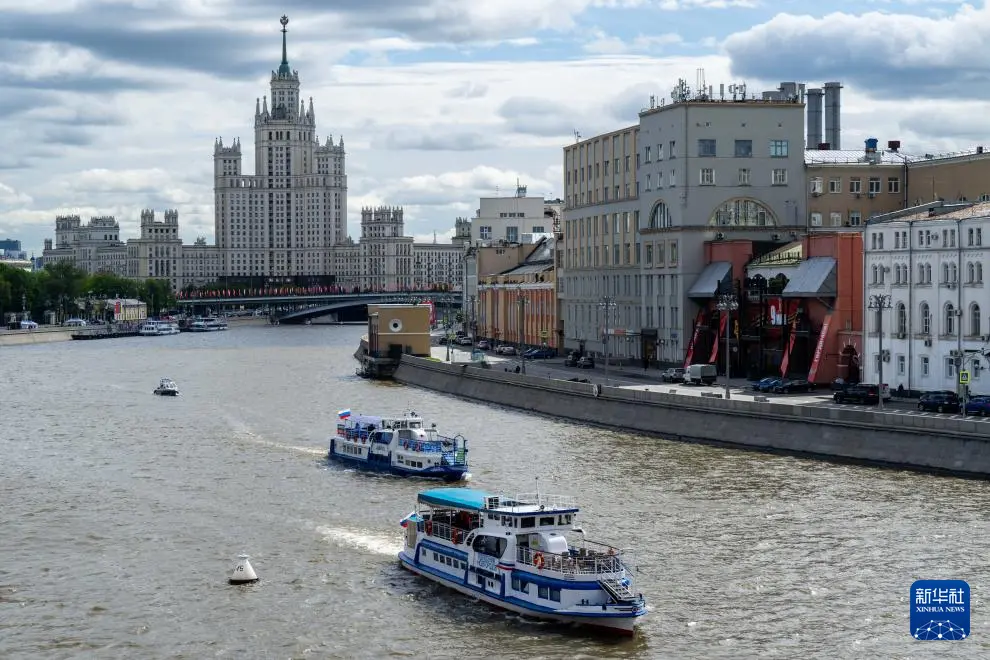 5月5日,在俄罗斯莫斯科,游船在莫斯科河上航行。
