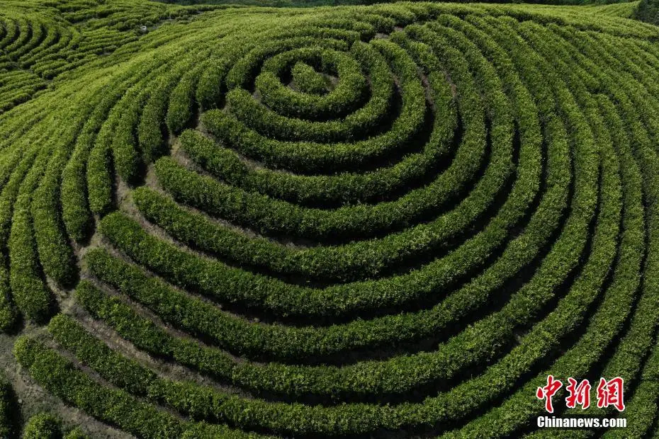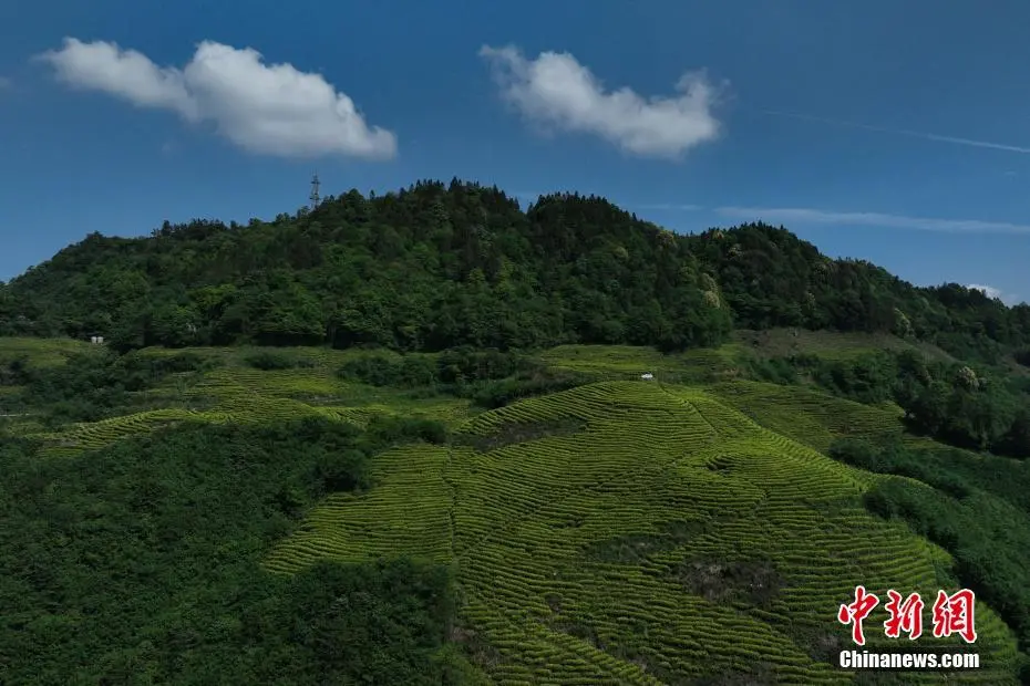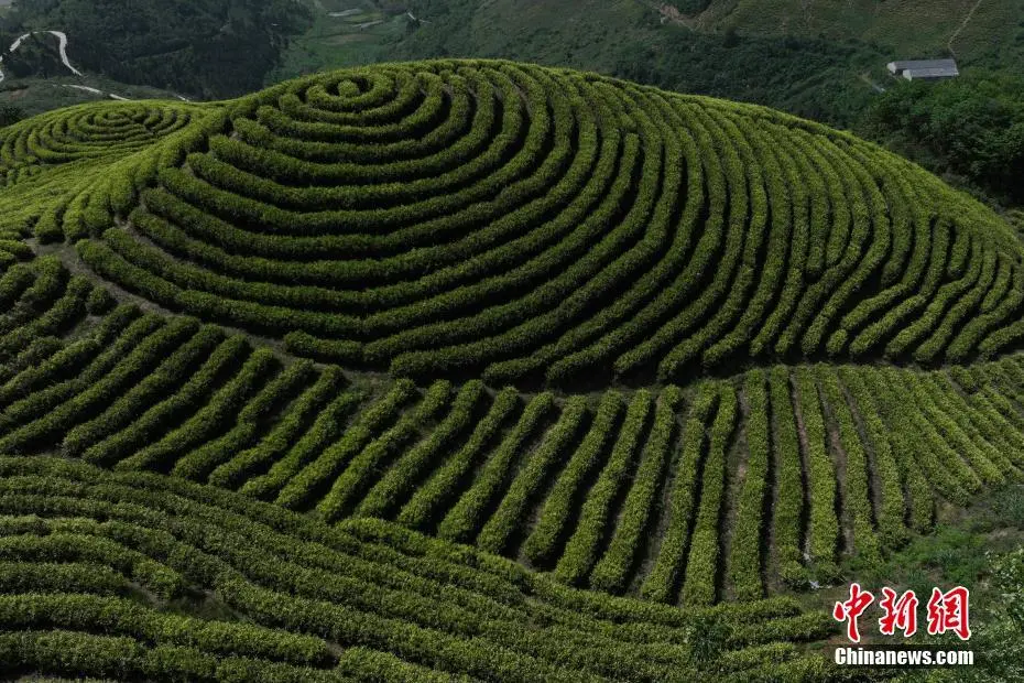 5月初,初夏时节,在四川省达州市大竹县云雾山万亩白茶基地内,通过无人机俯瞰,一行行茶树在山间有序排列,如同“大地指纹”。李相芬 摄