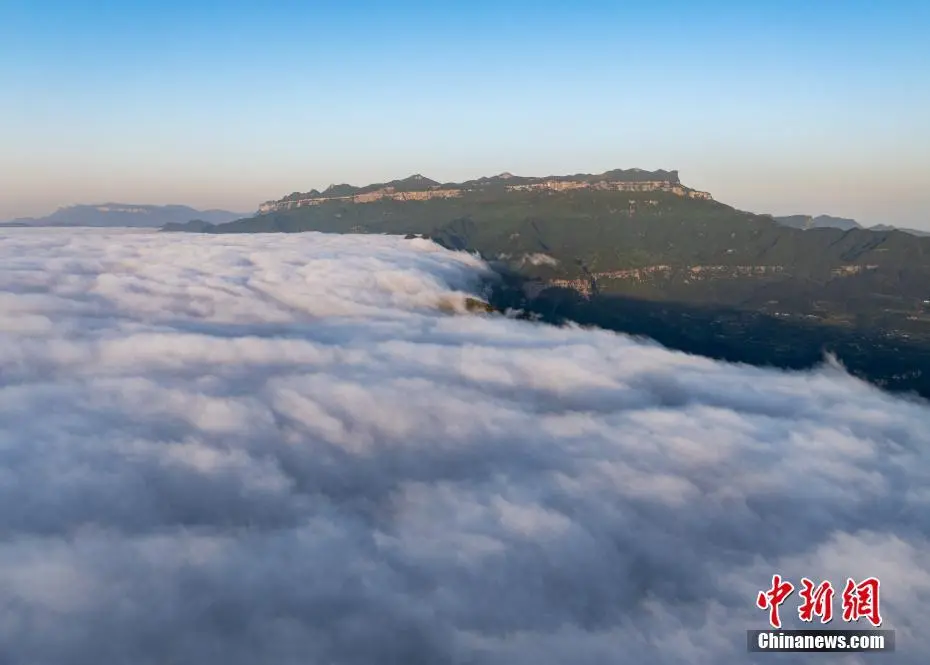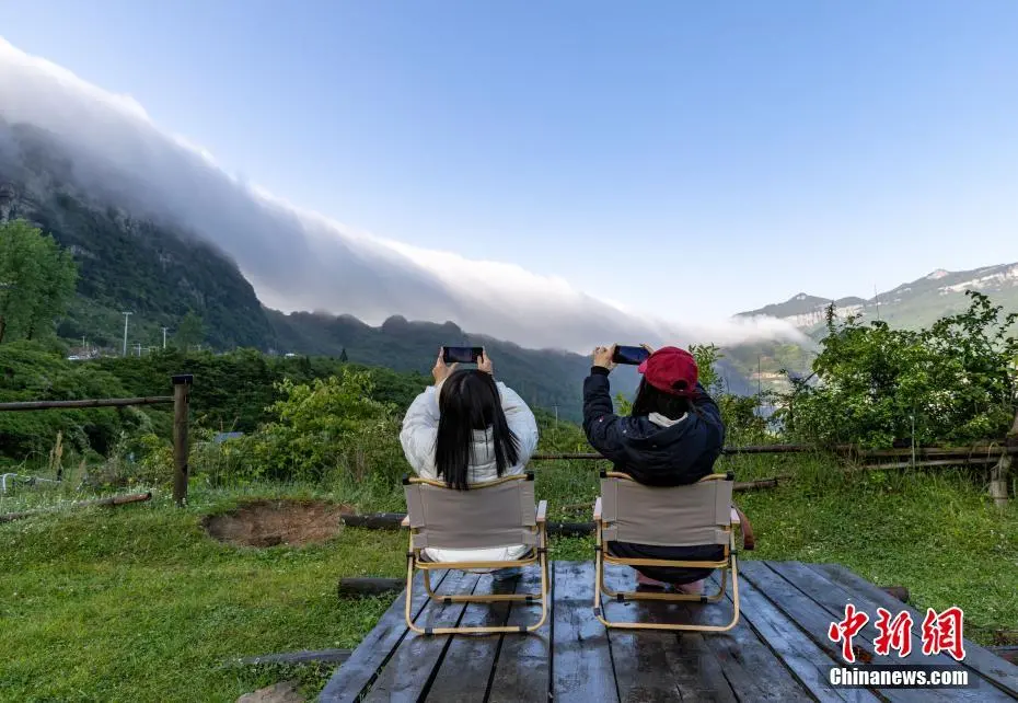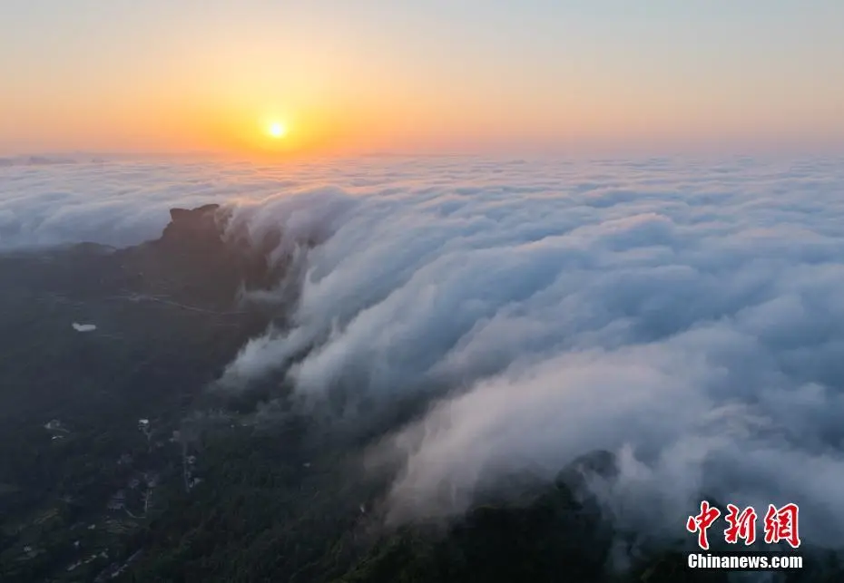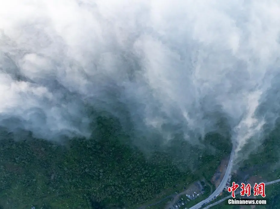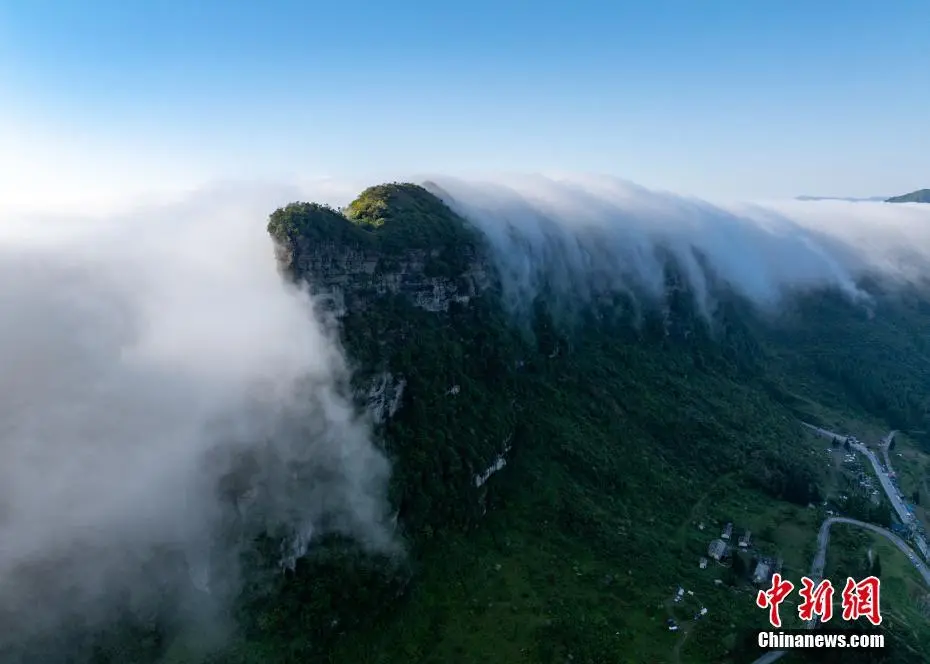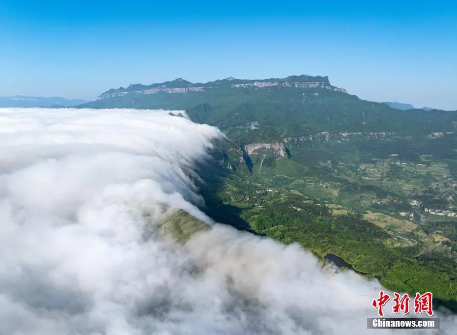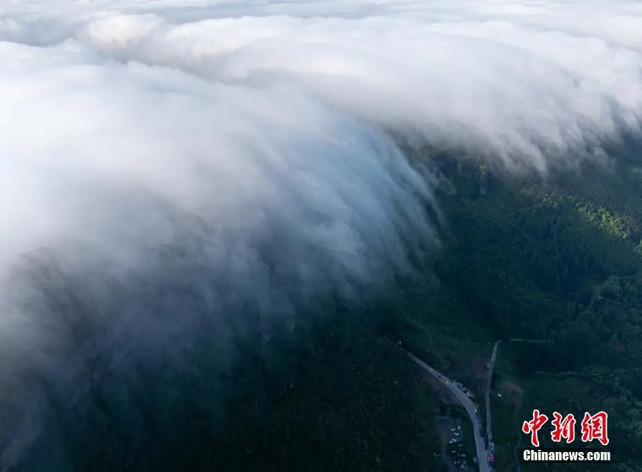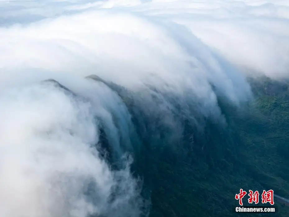 5月11日清晨,重庆市南川区金佛山东麓出现震撼的云瀑景观。洁白的云雾如瀑布般从山顶倾泻而下,山峦在云雾中若隐若现,宛若仙境。图为云瀑景观。罗川 摄