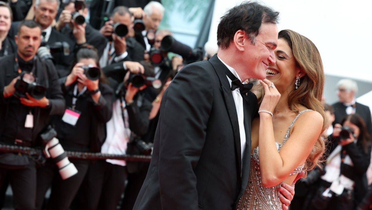 这一举动不仅为他激情四溢的开幕宣言画上惊叹号,也完美契合了他当晚在电影宫的全情投入。红毯环节中,塔伦蒂诺与妻子丹妮拉一同亮相,主办方甚至暂停了其他嘉宾的通行,让这对夫妇独享摄影师的镜头。照片显示,两人时而甜蜜依偎,时而耳语轻笑,摆出多组亲密姿势。