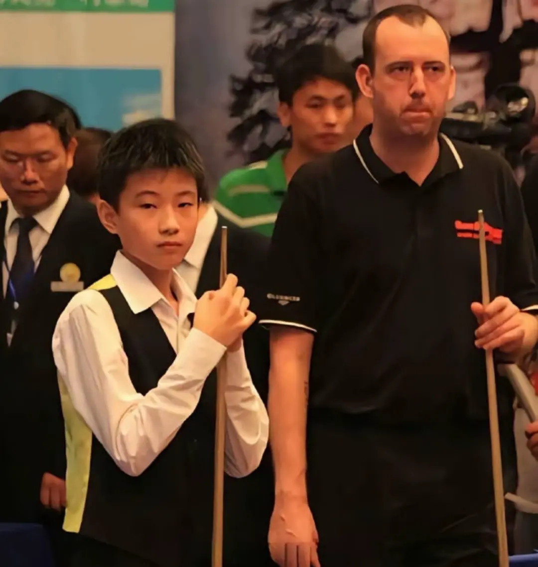 2011年斯诺克表演赛上14岁的赵心童和36岁的马克·威姆斯