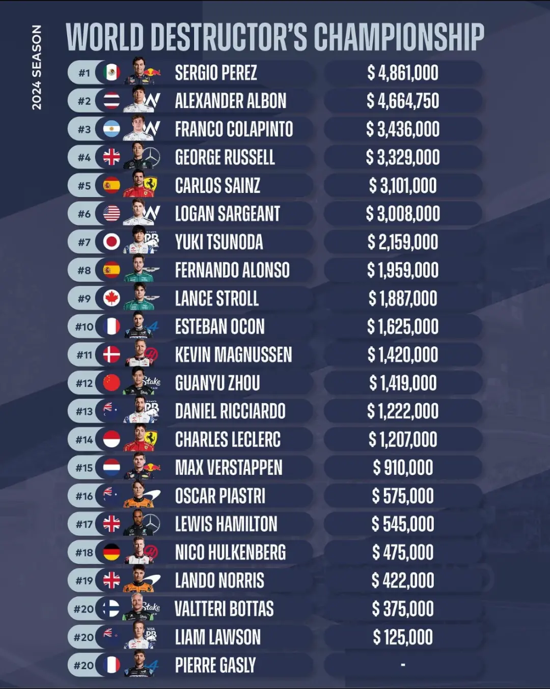 2024赛季F1车损费用排行榜