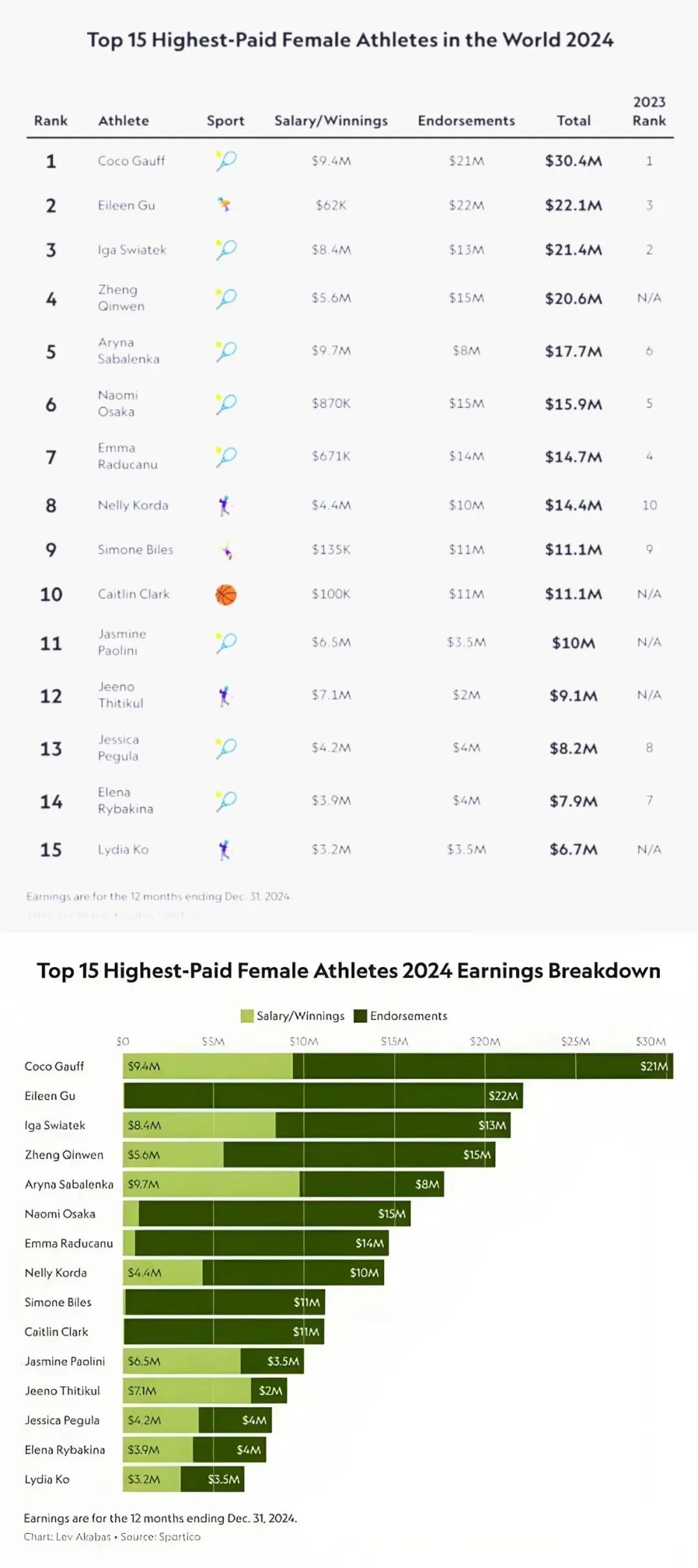 福布斯2024年全球女子运动员收入排行榜