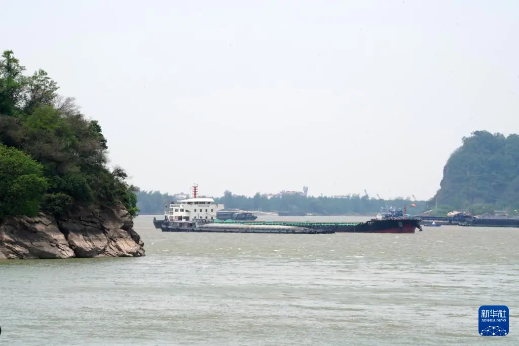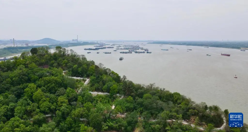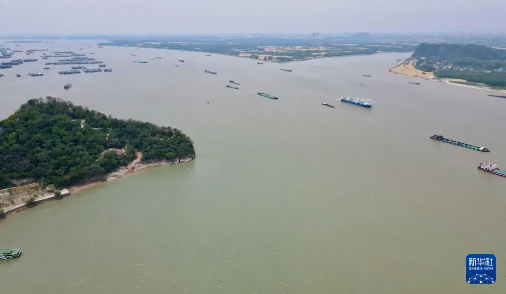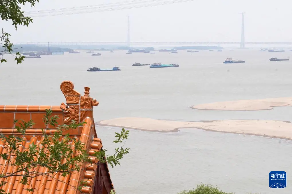 5月13日在天门山上拍摄的繁忙的长江航道。