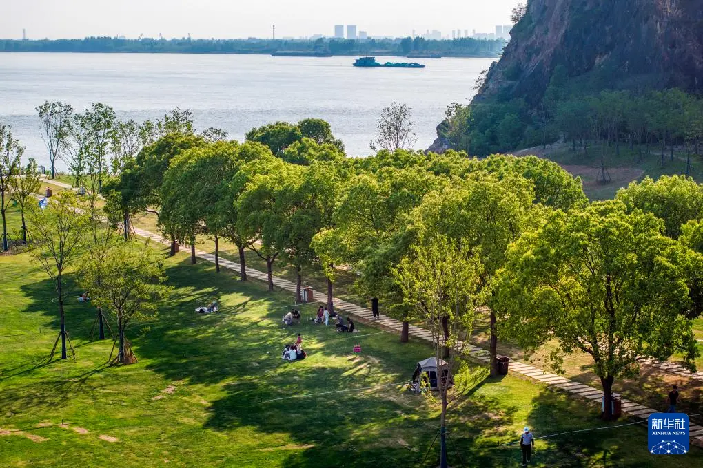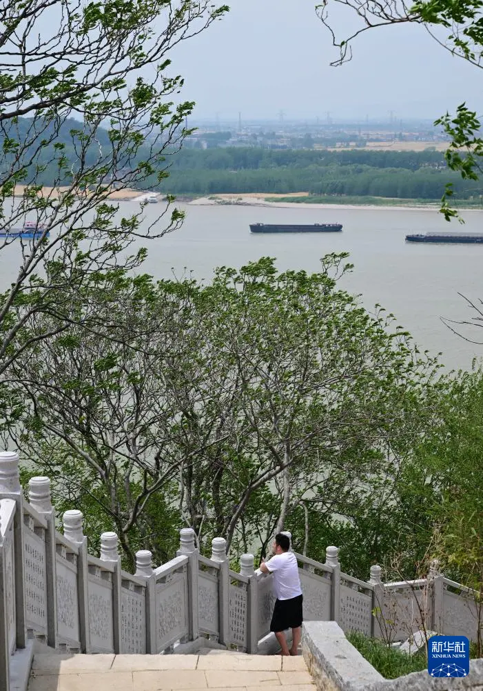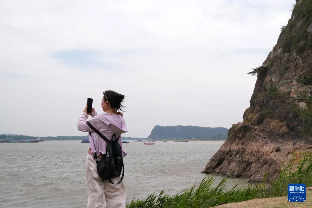5月13日,游客在天门山脚下的长江岸边拍照。