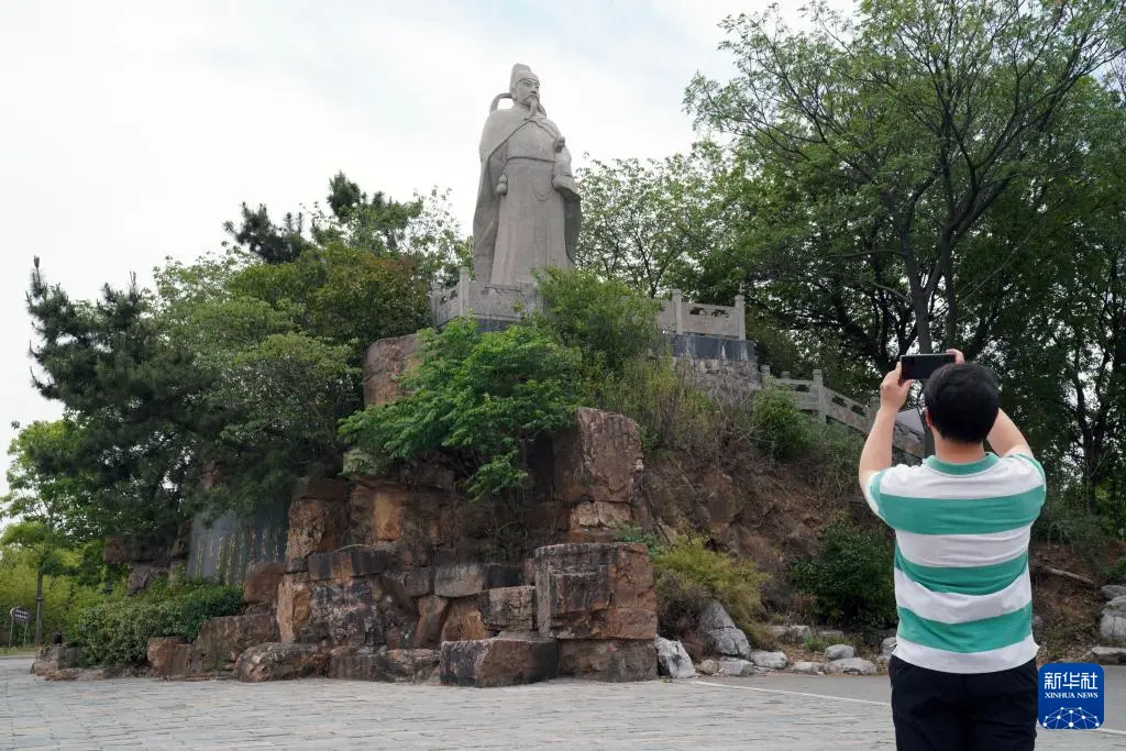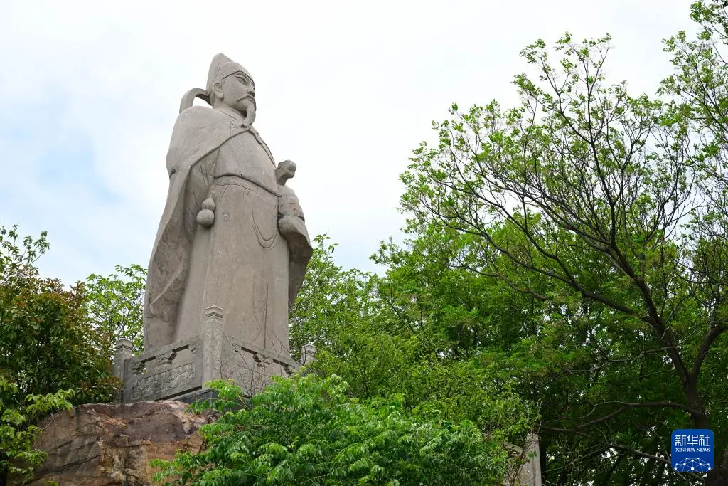 5月13日拍摄的天门山与景区内的李白雕像(无人机照片)。