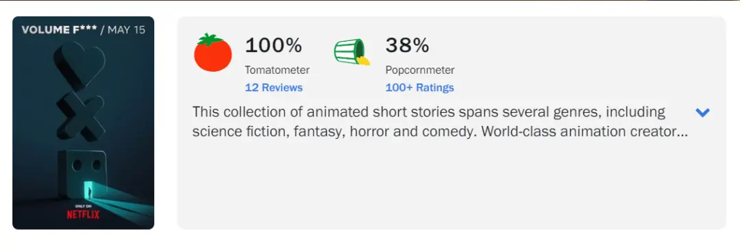 这一季的《爱死机》确实没有迎合任何观众。在国外影视评分网站烂番茄上,也出现了专业影评人给100%、观众却只想打38%的两极分化,说明《爱死机》第四季在专业视角和大众接受度之间的巨大鸿沟。