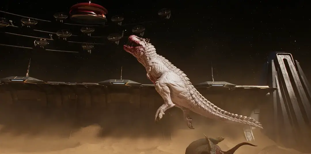 影片将古典角斗士叙事、史前生物与未来太空场景融为一体,在视觉冲击上确实无可挑剔。女主角与霸王龙从彼此的猎物转变为同盟,合力反杀贵族,最后一同坠亡。特别是结尾处两者对视的瞬间,叠加狼群在雪地中奔跑的蒙太奇,不仅象征着他们灵魂重获自由,也赋予了这场死亡以悲壮与诗意的解脱感。