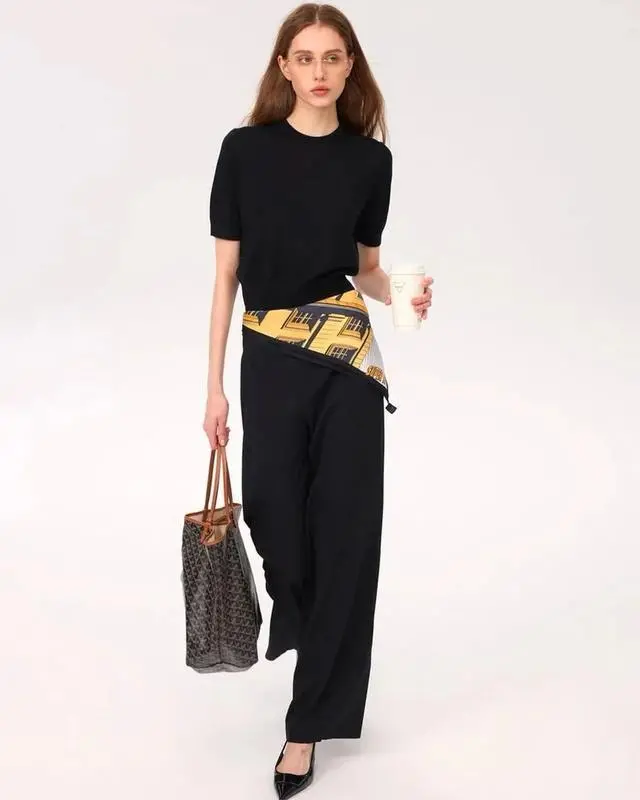 日常造型时还可以用丝巾展示叠穿哲学,在腰部系上一条丝巾,破坏正式感的同时,还能制造出知识分子风的儒雅。