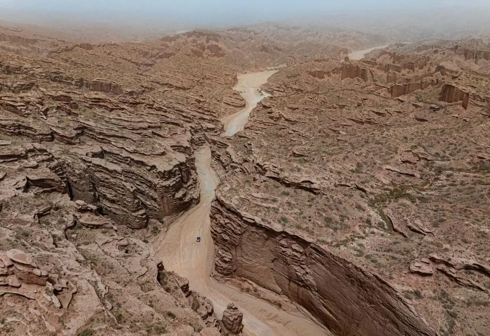↑5月21日,赛车行驶在第一赛段赛道上(无人机照片)。第一赛段比赛在新疆阿克苏地区温宿县进行,全长150多公里,包括高山、峡谷、河道等多种地形。新华社记者 胡星宇 摄