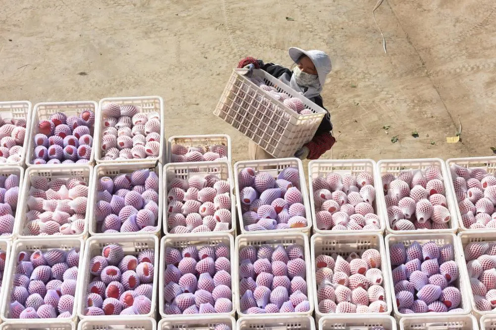 ↑2024年10月23日,在新疆阿克苏地区红旗坡农场,果农将装好箱的苹果整齐排列。地处新疆塔里木盆地的阿克苏地区地理位置和光照条件优越,当地种植的苹果皮薄肉嫩、甜脆汁多,深受消费者喜爱。新华社记者 高晗 摄