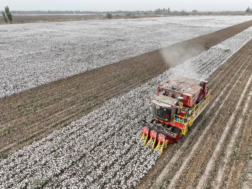 ↑2024年10月24日,在新疆阿克苏地区阿瓦提县,一台大型采棉机在棉田里作业(无人机拍摄)。新华社记者 高晗 摄