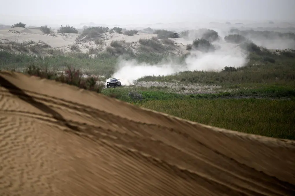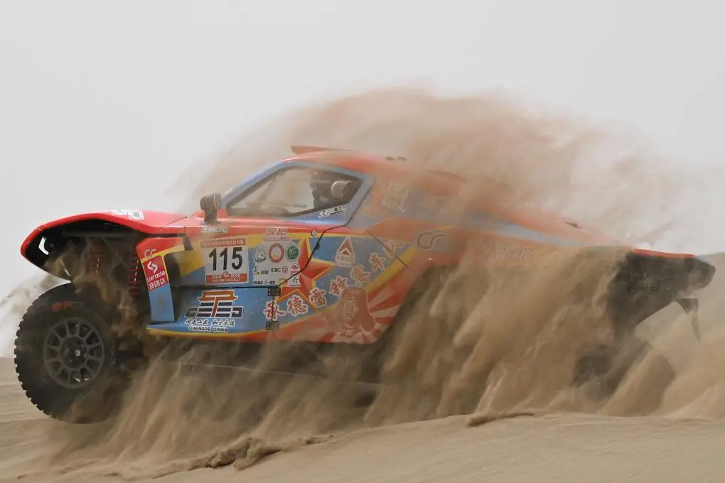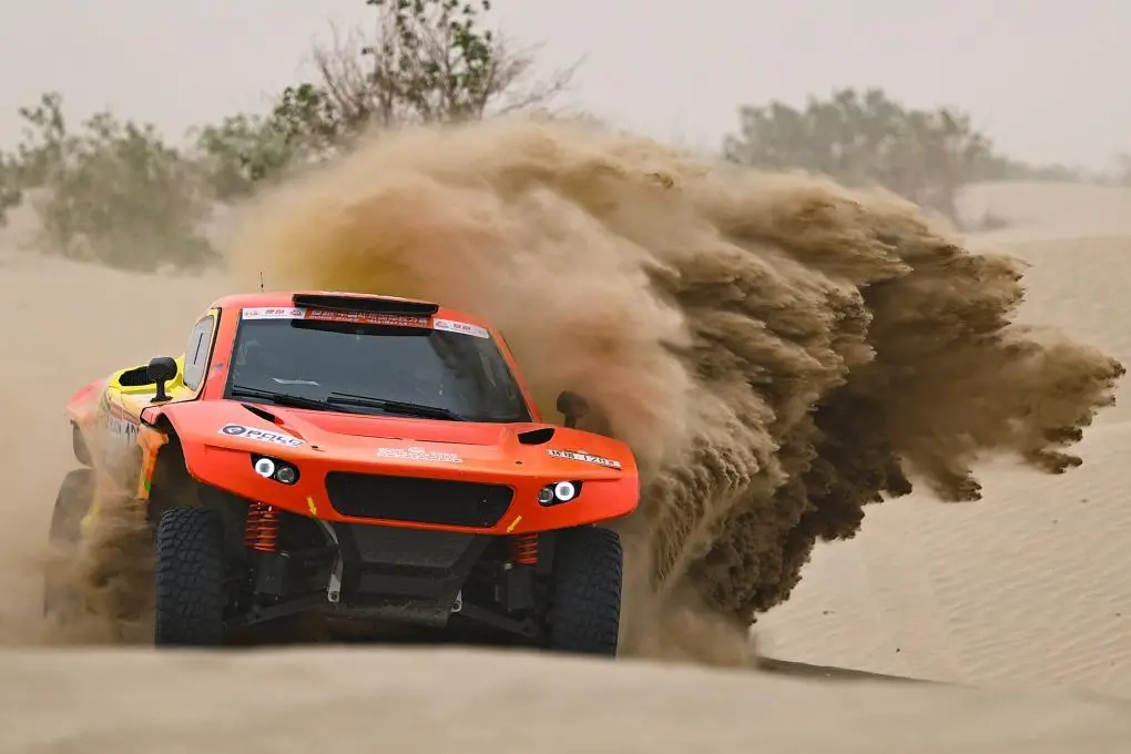 ↑5月27日,多耐减振器车队车手林德伟、领航员王洋在第六赛段比赛中。第六赛段在新疆和田地区于田县进行。新华社记者 辛悦卫 摄