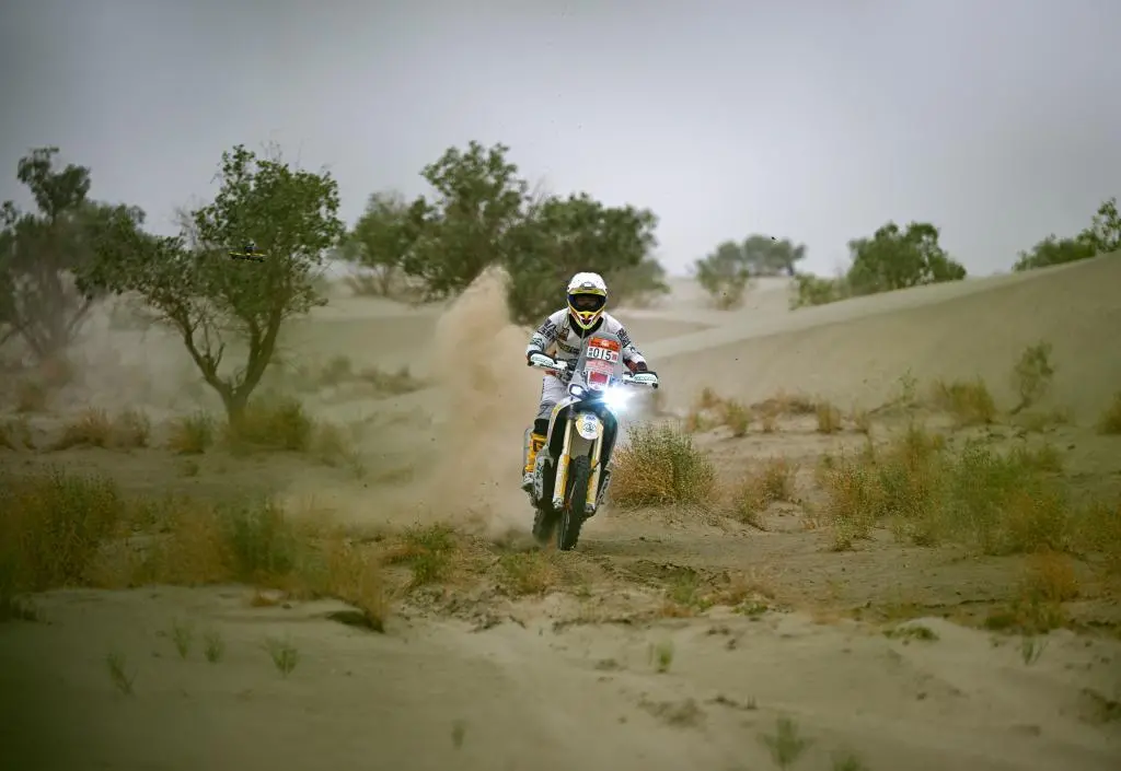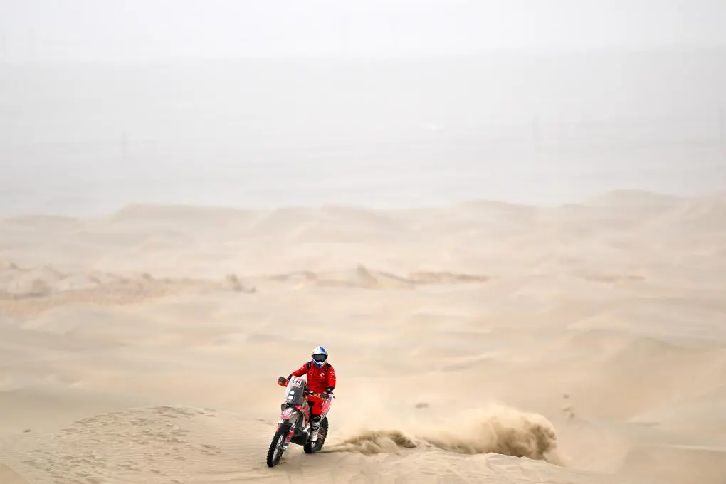 ↑5月28日,久骑控车拉力车队车手彭杨在第七赛段比赛中。第七赛段在新疆喀什地区叶城县进行,该赛段长82公里,以“沙漠+戈壁”的复合地形为特色,是今年最新启用的赛段。新华社记者 辛悦卫 摄