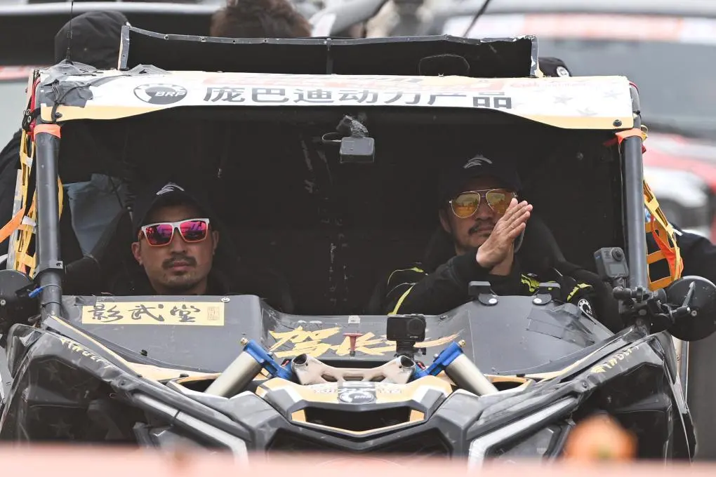 ↑6月1日,驾长车队车手吴京(右)、领航员梁冬冬在赛后参加收车仪式。新华社记者 辛悦卫 摄