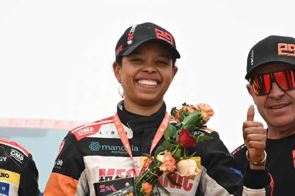 ↑6月1日,零公里润滑油ZM-Buggyra车队塞舌尔车手阿莉亚·科洛克参加收车仪式。新华社记者 辛悦卫 摄
