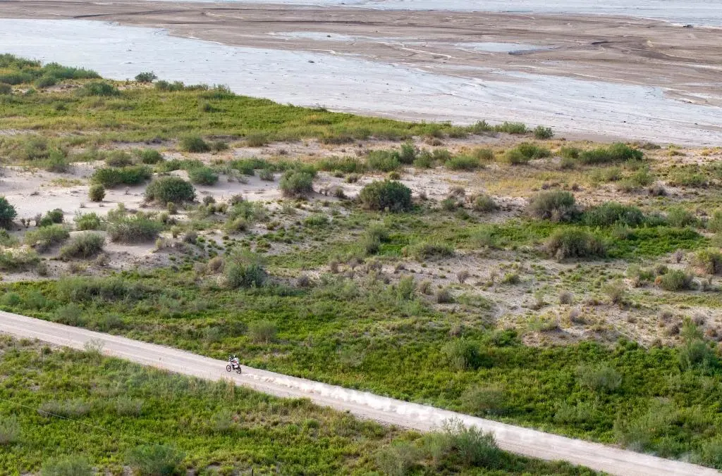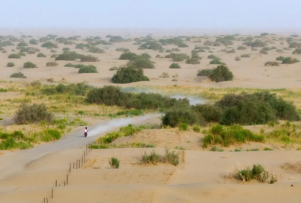 ↑5月26日,一辆摩托车行驶在第五赛段赛道上(无人机照片)。第五赛段全长280多公里,起点设于和田地区洛浦县,终点位于墨玉县。赛道以砾石路、软沙区、沙陇和戈壁混合构成,沿途穿越多片胡杨林,风景壮丽。新华社记者 胡星宇 摄