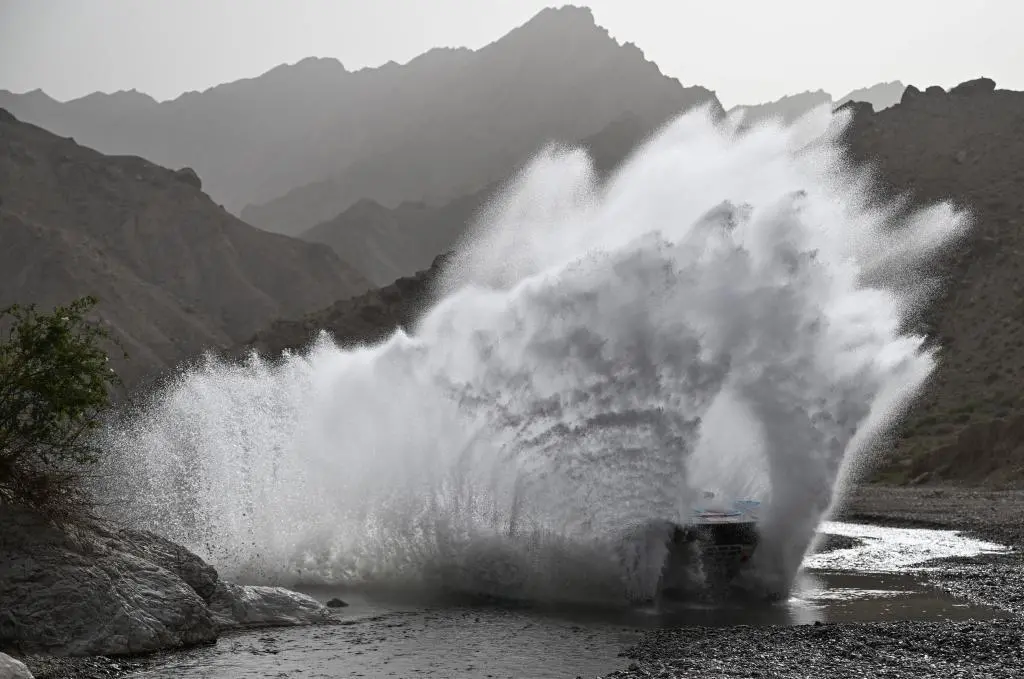↑5月23日,赛车在第三赛段比赛中冲过涉水路段。第三赛段比赛在新疆阿克苏地区柯坪县进行,该赛段长330多公里,以狭窄涉水峡谷、戈壁等地形地貌为主。新华社记者 胡虎虎 摄
