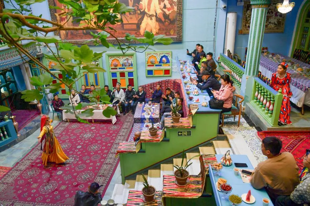 ↑游客在新疆喀什古城景区的一家民宿内欣赏歌舞表演(2024年4月29日摄)。新华社记者 王菲 摄